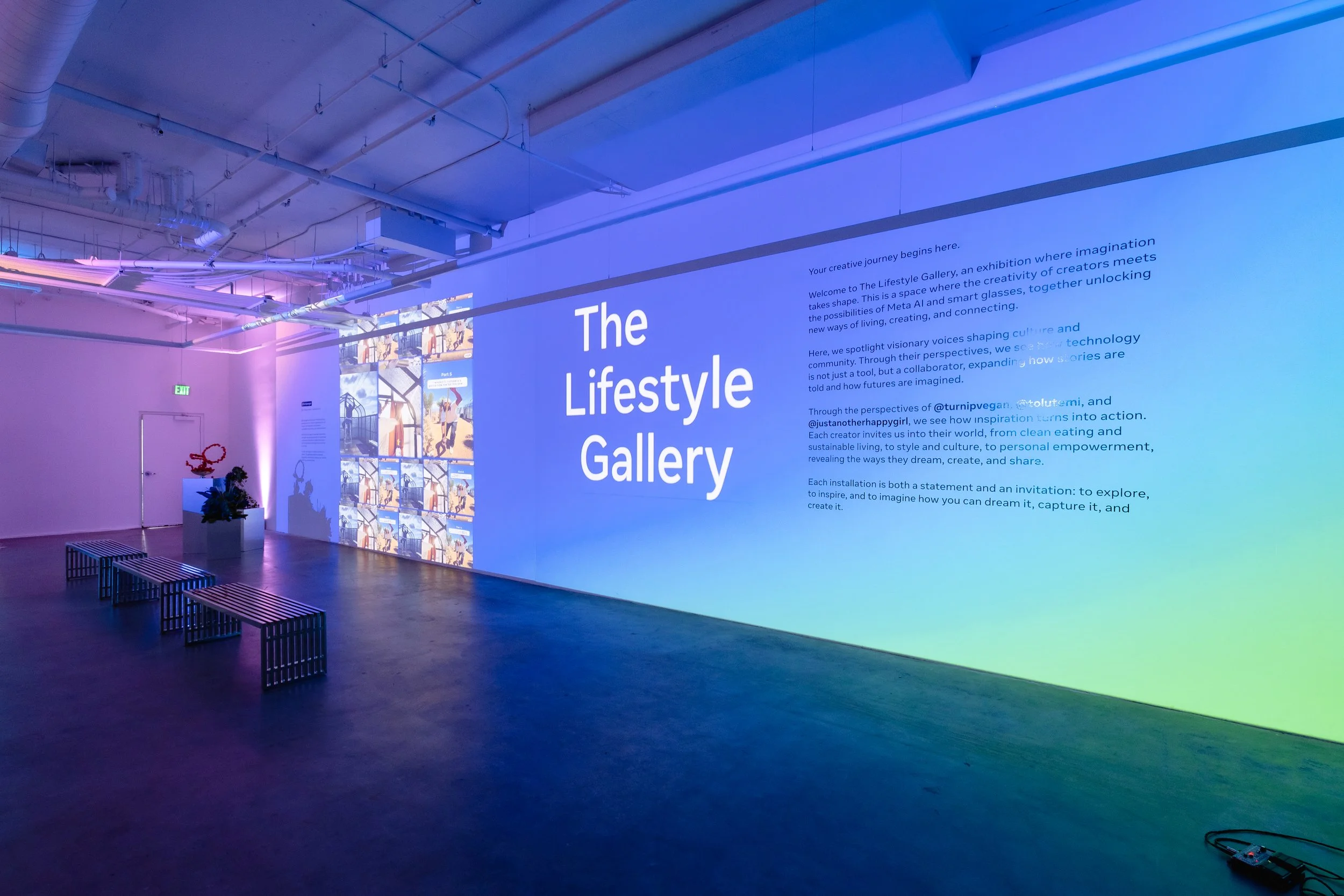 For the Meta Lifestyle Gallery, our team produced an immersive, projection-driven exhibition showcasing the Meta product suite—Instagram, Meta AI, Ray-Ban Meta, and Edits—through the lens of creator storytelling.